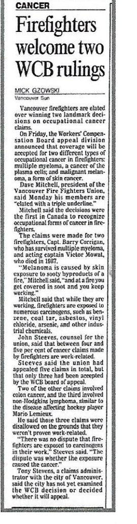 While the history of cancer with Vancouver Fire Union Local 18 only goes back as far as the late 1980’s. One can make a presumption that it goes back a lot further.